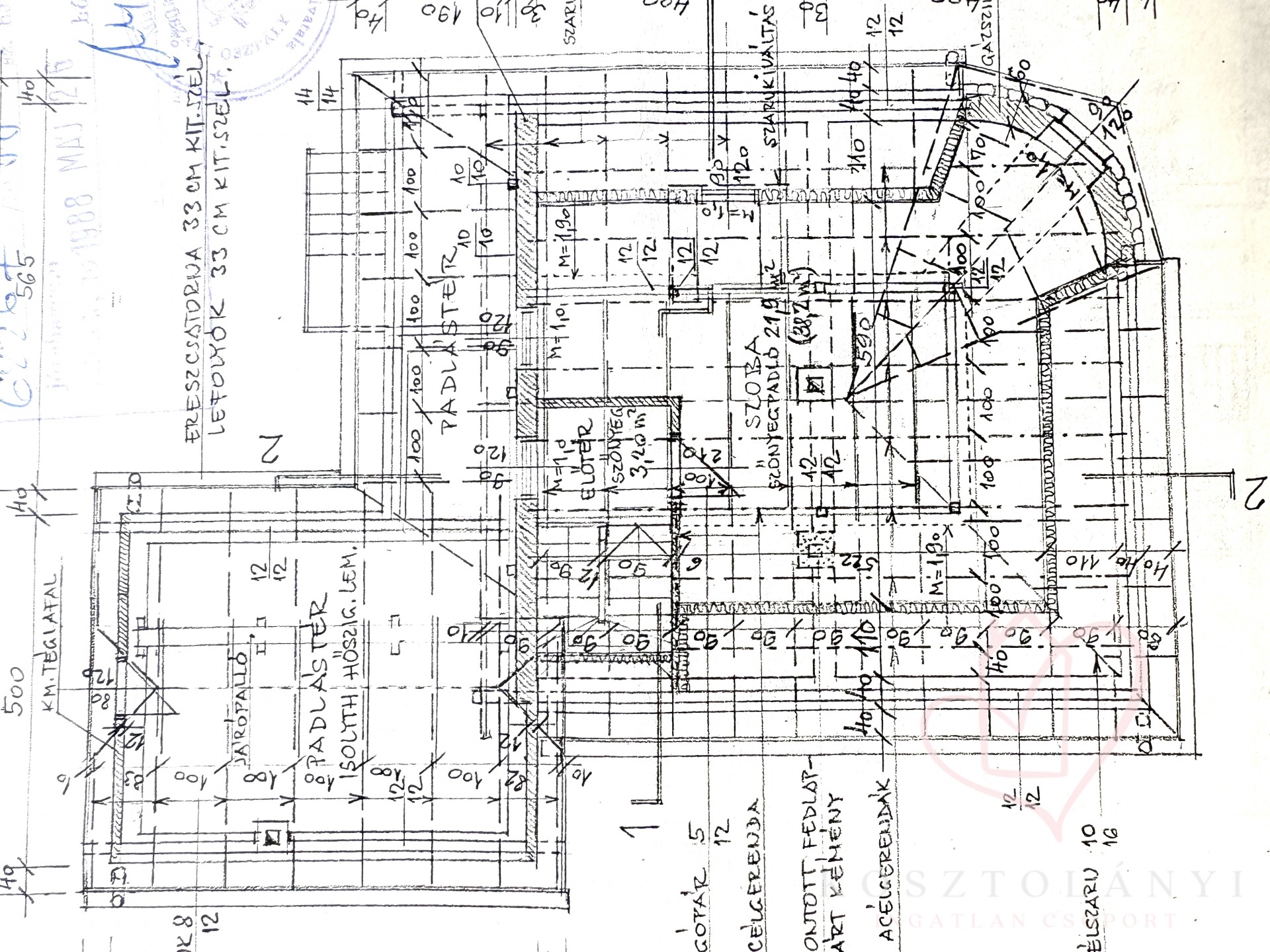 *** Falazat: A földszinten masszív tégla, míg az 1988-as bővítés során az utcai homlokzaton kő és gázszilikát vegyes falazat, az udvari oromfalnál pedig 30 cm-es gázszilikát épült.