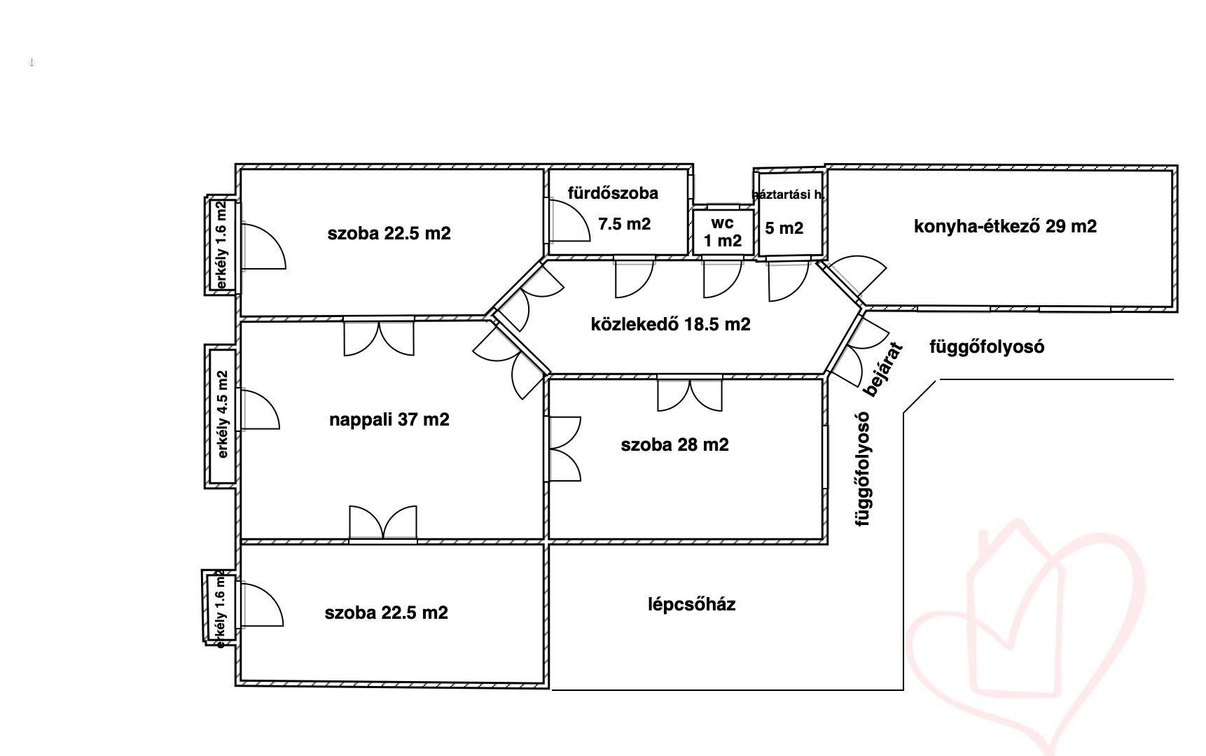 - 3 db különnyíló szoba, ( 22.5m2,) (37 m2,) (22.5 m2)